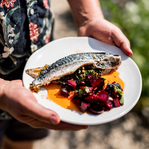 Butterflied mackerel stuffed with a punchy North African sauce and gently smoked on an Alder Cooking Plank, served with dirty cooked baby beets.